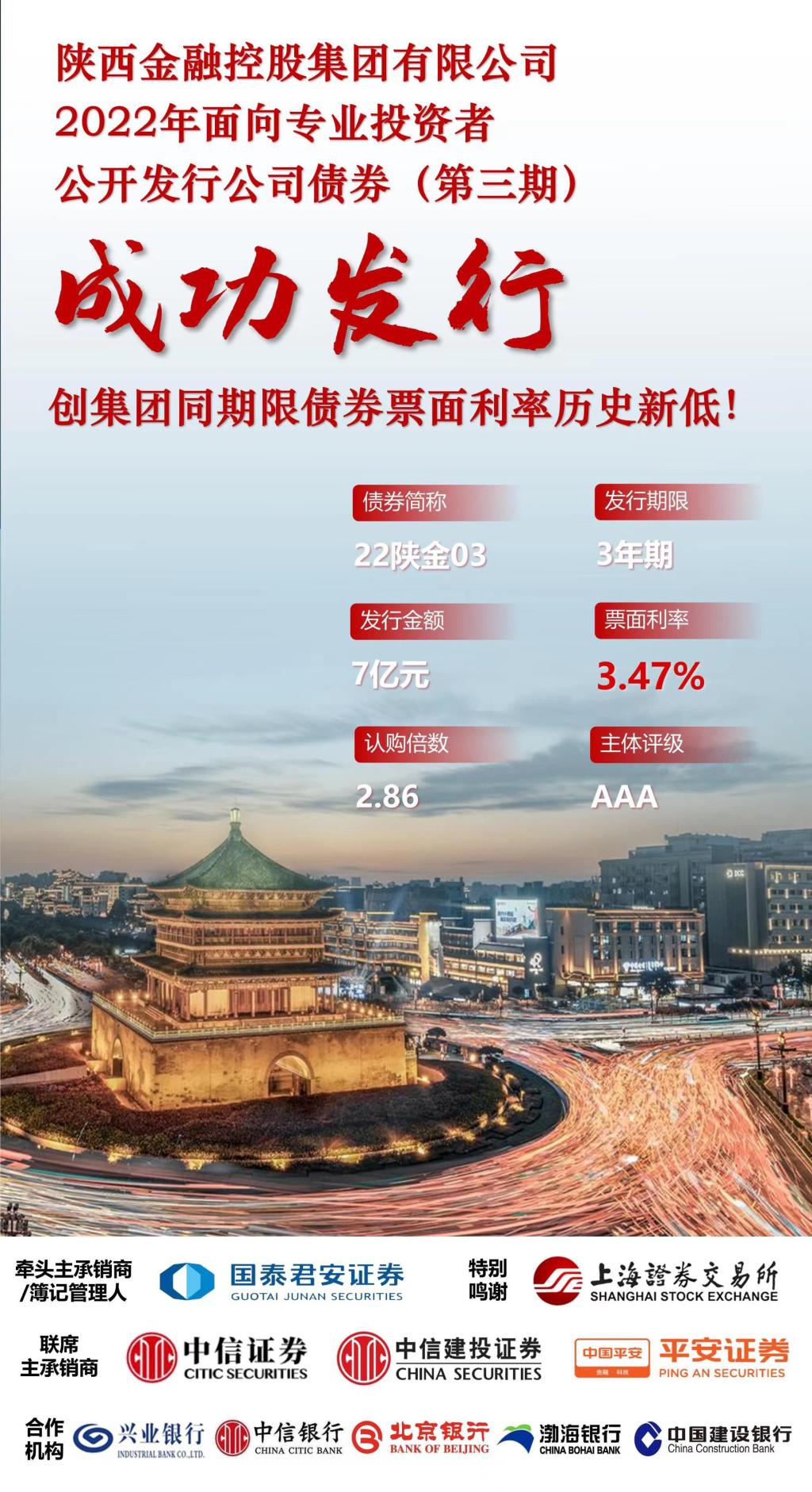 2022年面向专业投资者公开发行公司债券(第三期)成功发行。本期债券发行规模7亿元,发行期限3年期,票面利率3.47%,全场认购倍数2.86,创集团同期限债券票面利率新低。