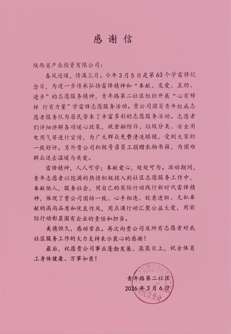 3月6日,产投公司收到来自青年路第二社区送来的感谢信。信中,社区对产投公司志愿者们在学雷锋日活动中所展现出的无私奉献精神和专业服务态度给予了高度赞扬。感谢信提到,志愿者们不仅为社区居民提供了实实在在的便利,更用点滴行动汇聚公益大爱,充分彰显了国有企业的责任与担当。