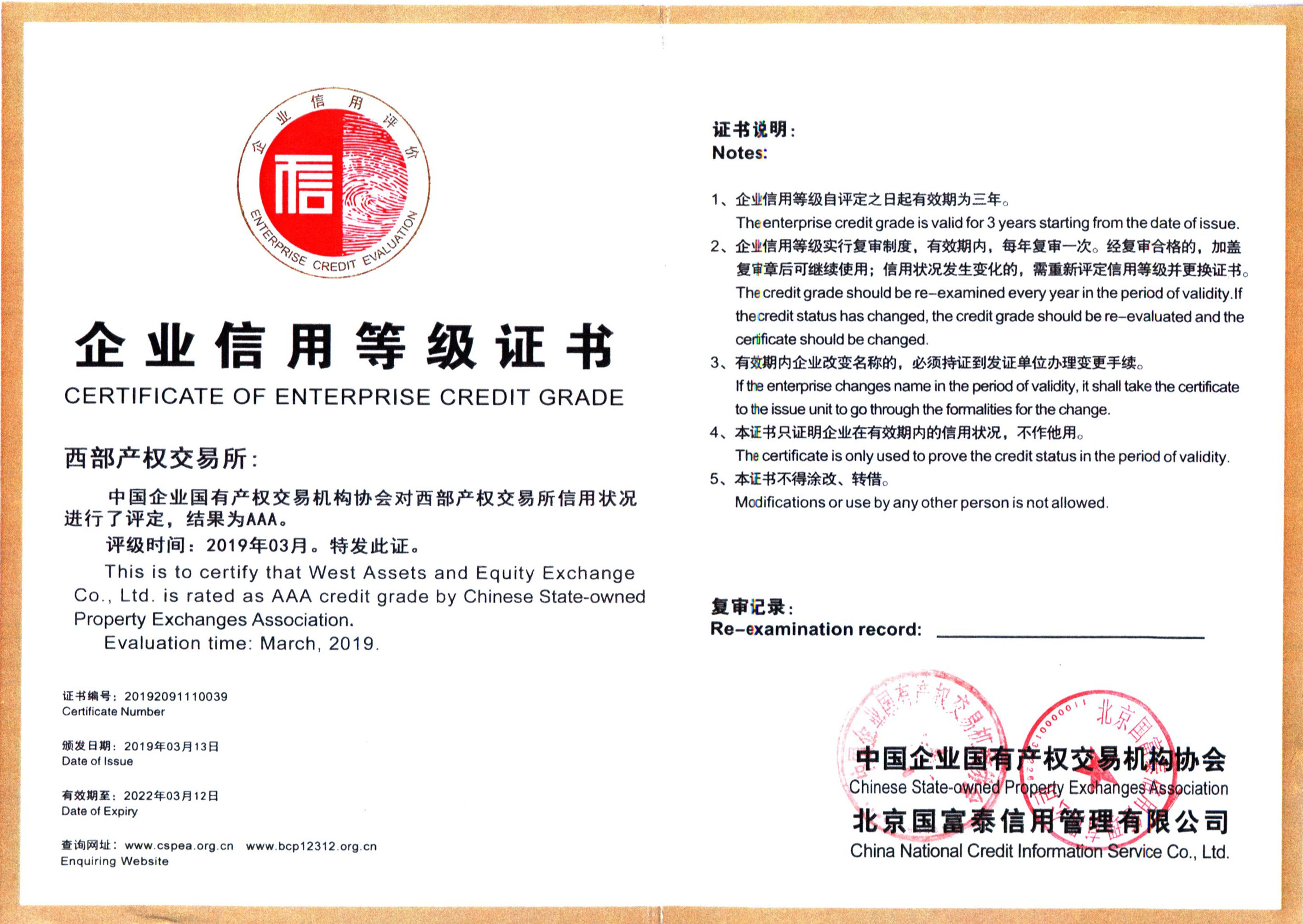 企业信用评价AAA级