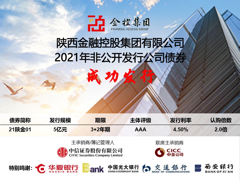 陕西金融控股集团2021年非公开发行公司债券于7月29日成功发行。本期债券发行规模5亿元,期限3+2年期,...